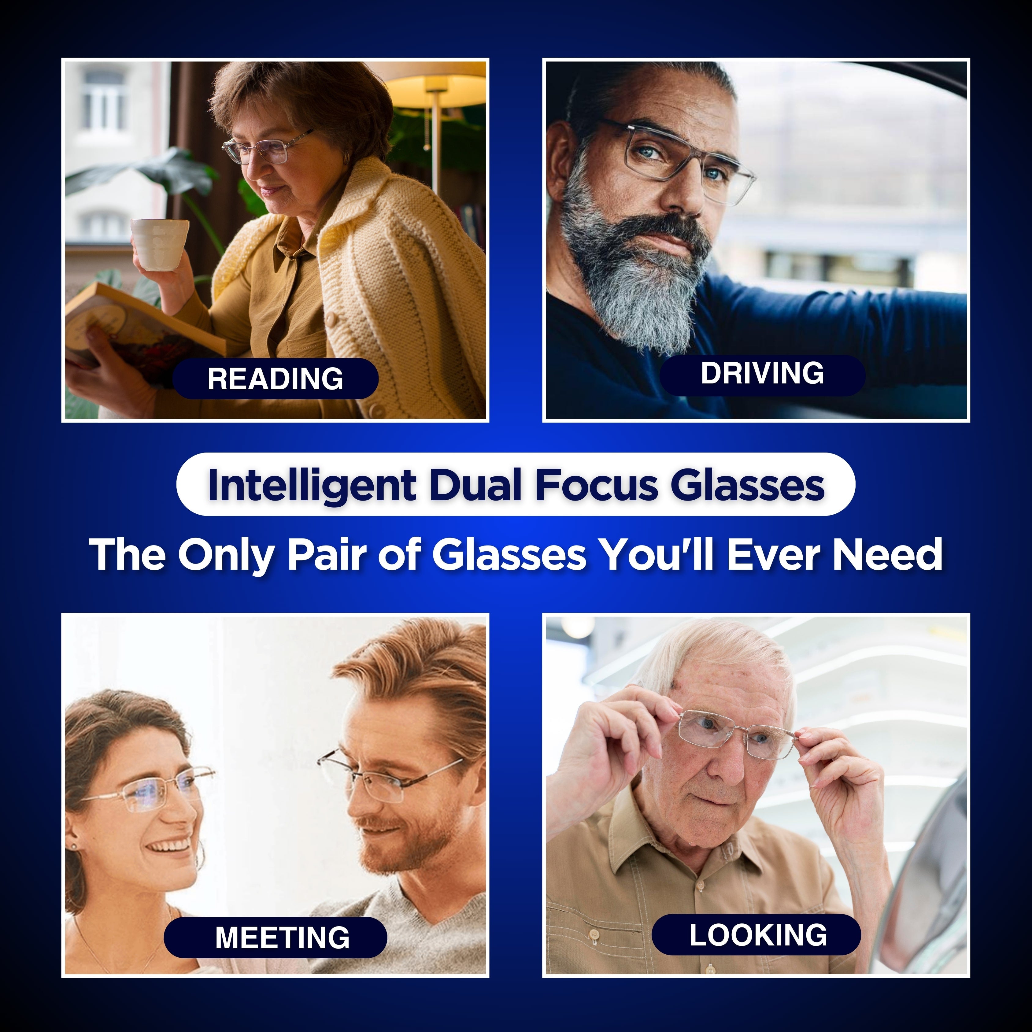 Intelligent Dual Focus Glasses are designed with modern vision in mind. The dual-zone lenses allow your eyes to shift naturally between near and mid-range tasks, without straining or constantly taking your glasses off.